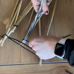 Use hot glue to attach each of the bamboo loops to the back of the half circle piece of plywood. This will not secure them but it will be good enough to keep them in place for you to flip the entire thing over. Once flipped I covered them with duct tape, then cut little blocks from scrap 1x2s to fit between each of the loops and brad nailed those down. I also found that brad nails easily secure the bamboo as well so I added some to those as well.