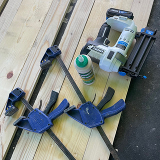 Take your 1x4 and run a bead of wood glue along the edge length wise and place on top of the 1x8 like the pictures above. Clamp together so the 1x4 is flush with the edge of the 1x8 and secure with 1.5" brad nails. Repeat this on the other side of the 1x8 with the other 1x4 you cut to length. Let these dry at least a couple hours before the next steps.