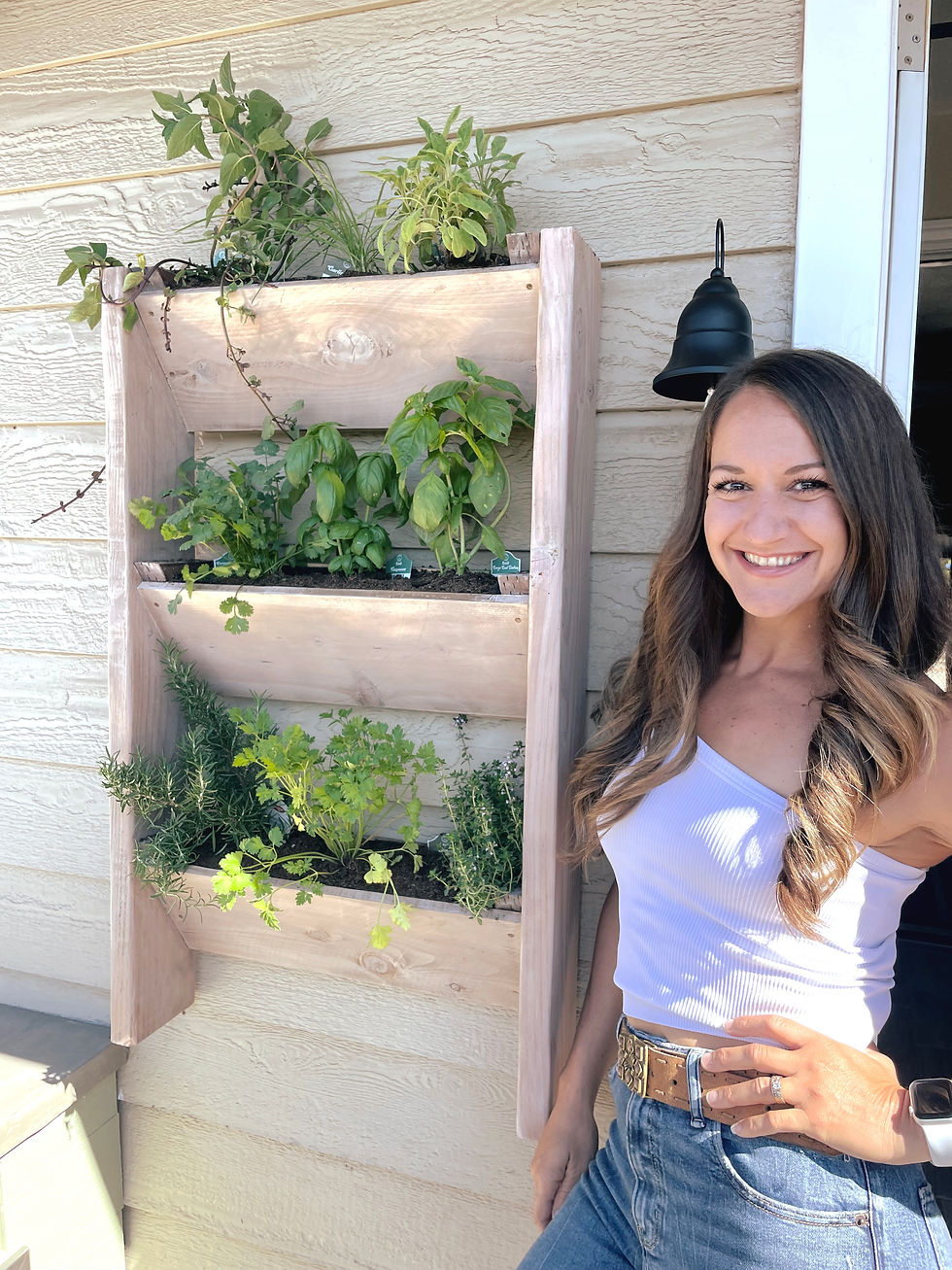 Hang and fill! I found the studs on my wall, leveled the herb wall and secured it by drilling through one of the back fence boards directly into my siding. Than I filled it with soil and my favorite herbs!