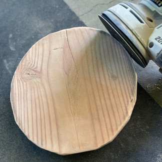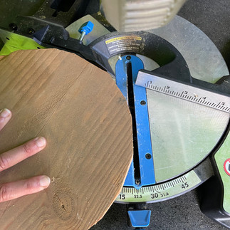 Take the 2x10 scrap piece and cut it down to a 10" piece so that it is a square. Set the miter saw to 22.5" and make small cuts to the corners of this square, rotating as you go until it starts to become a circle. This could also be done with a jigsaw but I liked the rougher edges this technique gave. Once it looks like a circle, sand the entire piece smooth with low grit of 60 to shape and high grit 220 to smooth. Lastly, find center and mark it on the bottom.