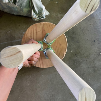 Place the metal angle plates centered around the center dot you made. Mark the outline of where they will be placed. Now you need to secure each angle plate to each dowel leg. When securing be sure to have the short end of the angle on the leg be upright and the thicker part of the angle plate be upright. Secure with 2" screw. Next place the legs with the angle plates back on the circle piece and secure with the screws provided in the kit.